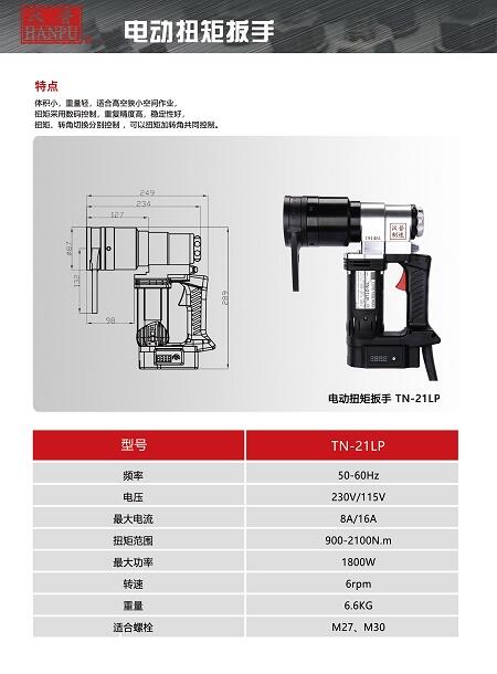 汉普电动扭矩扳手Y系列TN-21LP体积小、重量轻,适合高空狭小空间作业,扭矩采用数码控制,重复精度高,稳定性好,扭矩、转角切换分别控制,也可以扭矩加转角共同控制。每台Y系列电动扭矩扳手标配一套套筒。无冲击连续旋转,到达预设扭矩值自动停止作业。稳定性,可靠性更佳。