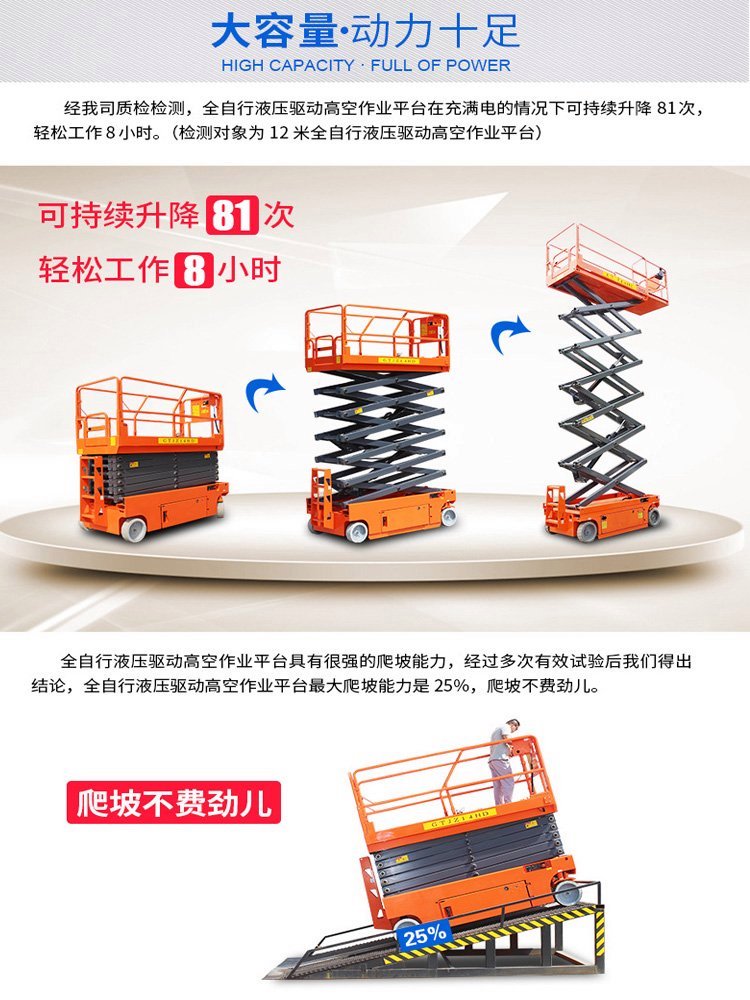 全自行升降机是用途广泛的高空作业设备。它的剪叉机械结构,使升降台起升有较高的稳定性,宽大的作业平台和较高的承载能力,cm03使高空作业范围更大、并适合多人同时作业。升降动力分为220V或380V电源,柴油机,或电瓶动力源,特殊环境也可采用防爆泵站及防爆电器。 升高4——12米,载重0.3吨。采用意大利和国产液压泵站,台面使用防滑绝缘扣板,具有防滑,绝缘、安全,请放心使用。它使高空作业效率更高,安全更保障。