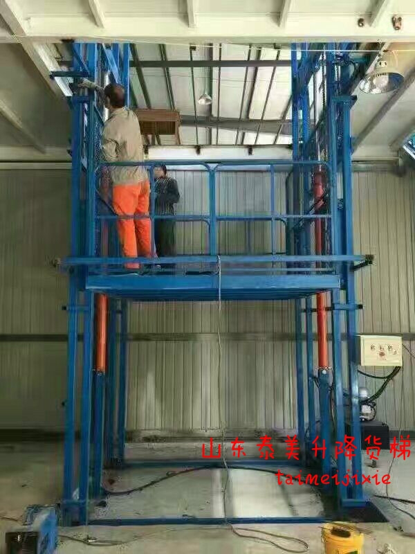 山东泰美升降机械制造有限公司升降货梯可根据用户的要求,定做不同尺寸,不同吨位的单叉各种异型升降平台(升降机、电梯、液压货梯、杂物电梯)产品规格:本类产品采用钢架结构或高强度钢板结构,承载能力由0.3至30吨,升降范围从0.1到18米。设备尺寸可根据用户需求定做。操作方式可分为上下控制和地面单人控制,也可多层控制简介.