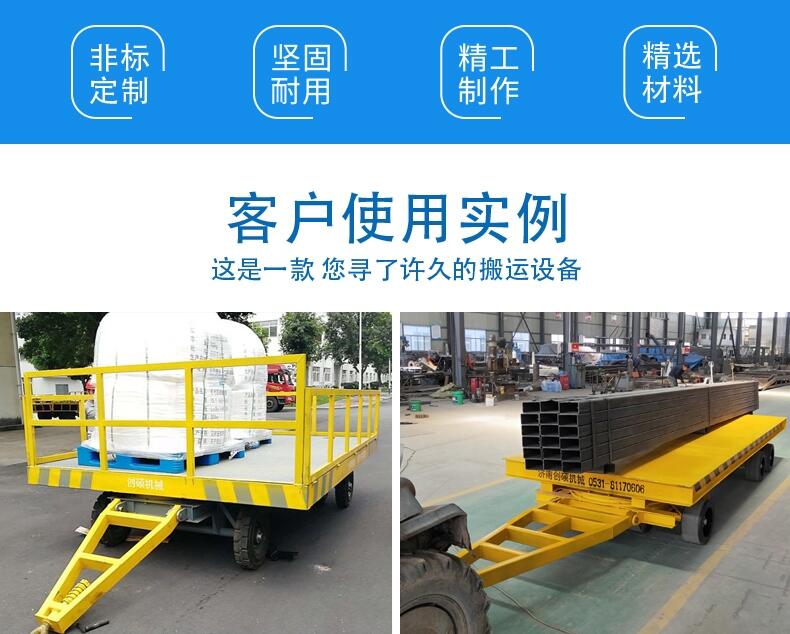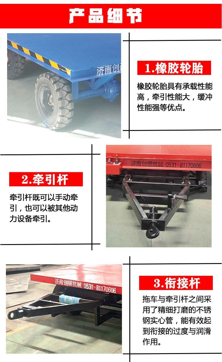 1、采用高弹性实心胎,能增强拖车的承载能力,提高使用寿命,采用空气胎则能减轻行驶过程中因路面颠簸对货物造成的损伤;采用压配胎,因轮胎高度较低,加强了整车的稳定性和拖车的承载力。尤其适合大宗模具的搬运。