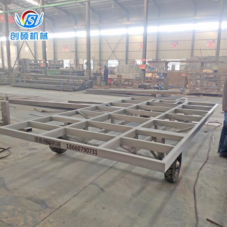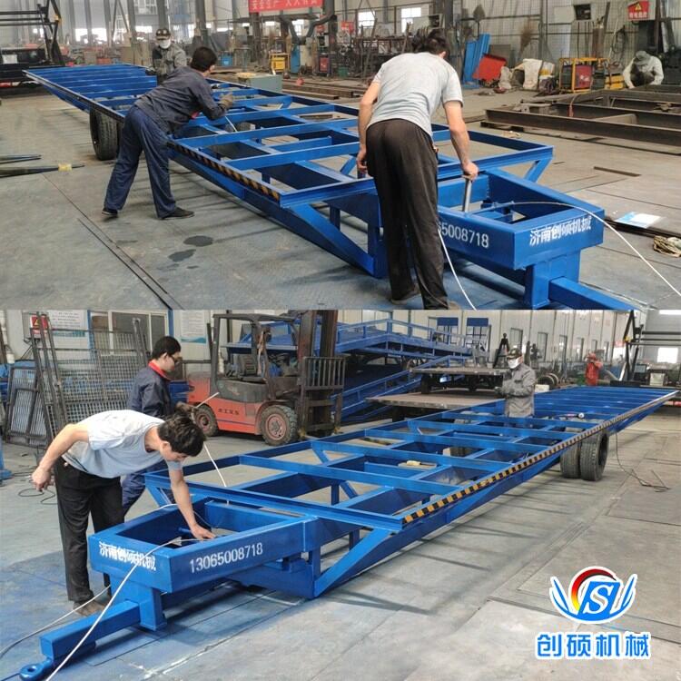 2、采用双悬浮式结构,悬浮式车架,轮轴自动摆动调节,保证在凸凹地面,保证车体水平且轮胎受力均衡。提高运输过程中的安全性。