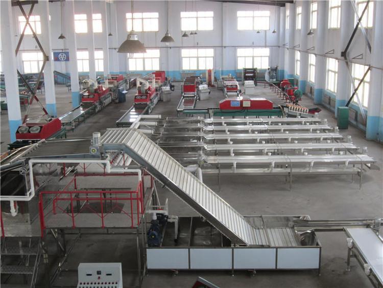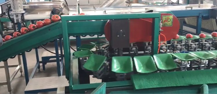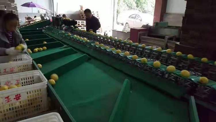 8、选果机先进的预排列技术。只需人工将水果倒在输送带上或上料斗,机械自动将水果进行排队,一个一个落入果盘进行称重分选。