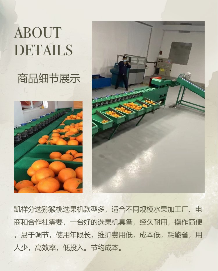 1、选果机一机多用、使用范围广,移动方便、易于维修。