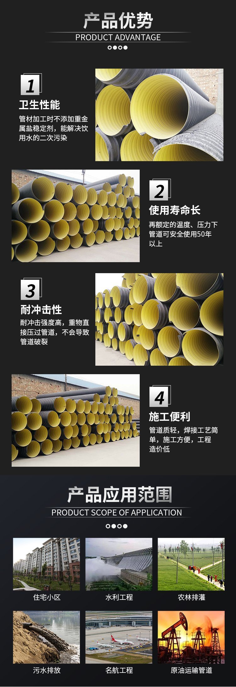 1、市政排水排污管网 2、污水处理厂滤液收集管道 3、工业污水排放管道 4、垃圾处理厂滤液收集管道 5、高速公路排水管道 6、电缆、光缆护套用管道 7、海水、雨水输送管道 8、集水系统、渗水系统管道 9、农业灌溉用输水管道 10、通风系统