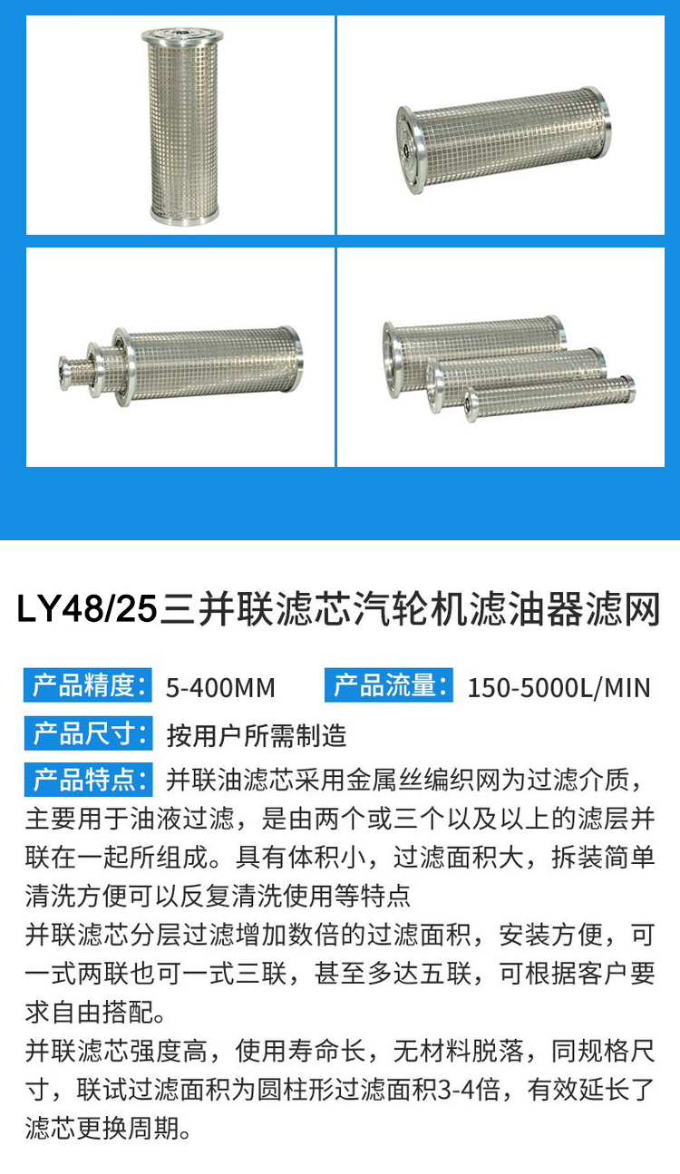 德亚不锈钢滤芯LY48/25汽轮机三并联滤清器非标定制电力设备产品 工作最大压差 | 12 | ||