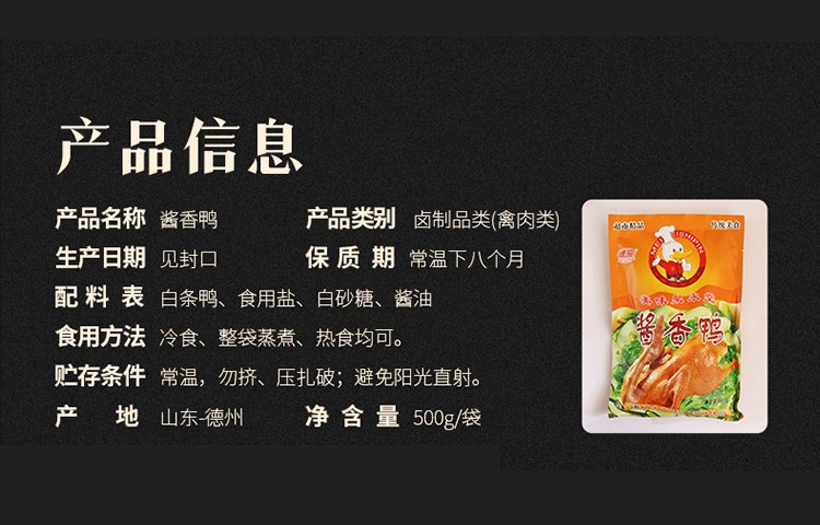 配料表 | 白条鸭、食用盐、白砂糖、酱油’ | ||