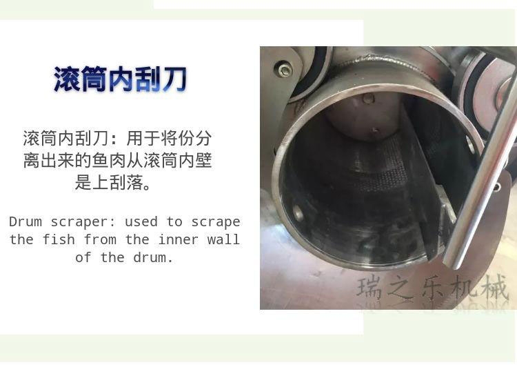 1、滚筒内刮刀:用于从滚筒内分离出来的鱼肉从滚筒内壁刮落