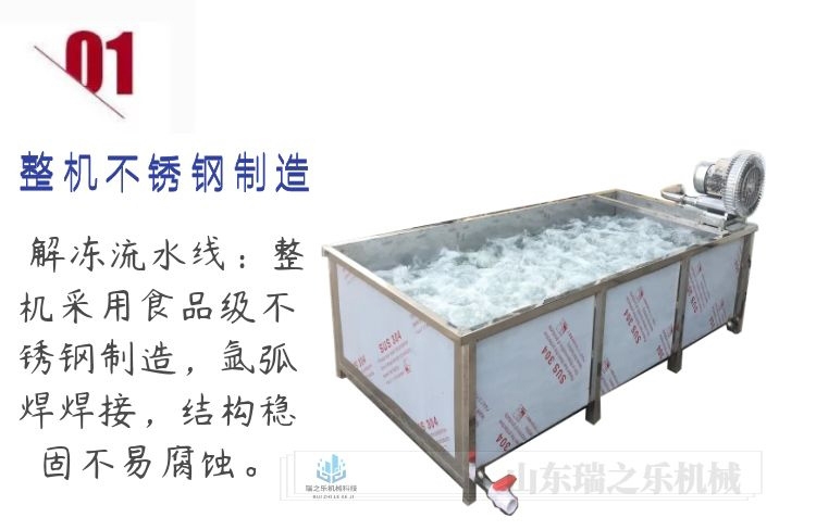 鲅鱼带鱼黄花鱼化冻流水线该机采用流动水为解冻介质,通过鼓泡装置,产生气泡将水翻腾流动,从而达到快速解冻的目的,解冻池旁边有恒温池(温度维持在15°-20°左右),水从恒温池流入解冻机内,随着冻品的水温慢慢下降,从投料到出料的这段时间,解冻池内的水从解冻进入到恒温池进行温度的中和置换,然后回流到解冻池内,如此循环利用,节约能源的消耗。设备输送电机具有调节变速功能,可根据生产需要调节输送带的输送速度,设备运行稳定,质量可靠,操作简单,卫生节能。