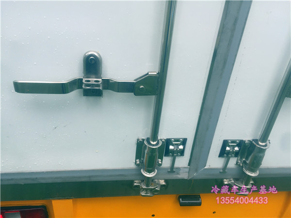 后门的构造以及密封特点:双后门门框架全部采用玻璃钢糊制成的整体框架,门板重量轻,防腐性能好。双后门中缝带斜度,开关方便。门边框密封采用进口优质橡胶(三元乙丙)密封条进行密封,保证厢体保温效果的稳定性