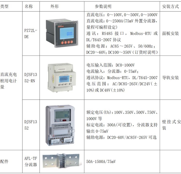 产品由测量单元、数据处理单元、通讯单元、显示单元等组成,具有电能测量、数据处理、实时监测、LCD显示功能。本电表符合GB/T33708-2017 静止式直流电能表、Q/GDW1825-2013 直流电能表技术规范、GB/T29318-2012电动汽车非车载充电电能计量、Q/GDW364-2009单相智能电能表技术规范相关技术要求。