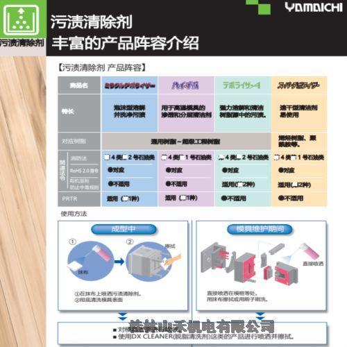 桂林山禾机电有限公司具有危险化学品经营许可证,有自己的化学品进口仓库, 是日本山一化学YAMACHI华南总代理,优势供应日本山一化学(YAMAICHI)工業株式会社生产的全系列产品:脱模剂、防锖剂、防锈剂、清洗剂、润滑剂、高温润滑脂,常用产品型号如下: 山一化学(YAMAICHI)防锈剂、气化性防锖剂 PART II ; 山一化学(YAMAICHI)脱脂洗净剂 E.O. CLEANER; 山一化学(YAMAICHI)金型脱脂清洗剂DX. CLEANER; 山一化学(YAMAICHI)离型剂 SEPALUCK NO.100S ; 山一化学(YAMAICHI)润滑剂RUST-CUT SP; 山一化学(YAMAICHI)除油脂剂 DEPO-RISER A ; 山一化学(YAMAICHI)除油脂剂SUPER DEPORISER; 山一化学(YAMAICHI)高温润滑脂GREASE NS1001; 山一化学(YAMAICHI)金型防锖剂 SUPER GUARDMAN 。