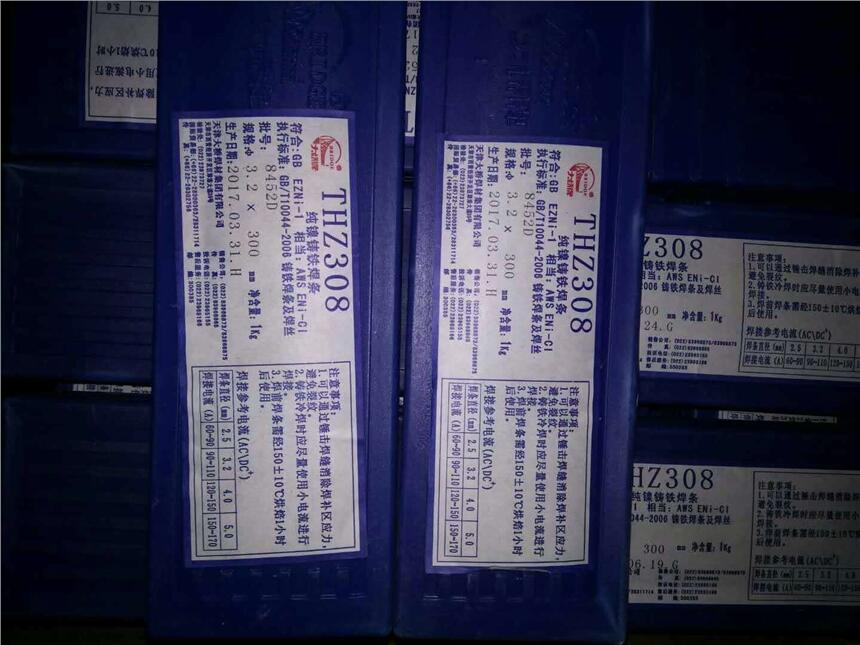Z308铸铁焊条 型号GB/T:EZNi-1 相当于AWS:EZNi-CI 说明:纯镍焊芯、强还原性强石墨化的铸铁焊条,施焊时,焊件可不预热,具有良好的抗裂性和加工性能,交、直流两用,工艺性能好。高韧性、高耐磨、耐冲涮磨损等。可焊性好。抗岩石砂磨粒磨损,延长设备使用寿命4-8倍。 用途:用于铸铁薄件及加工面的补焊,如汽缸盖、发动机座、齿轮箱以及机床导轨等重要灰口铸铁件。镍价格昂贵,应在其他焊条不能满足要求时才可选用。 熔敷金属化学成份/% C≤2 Si≤2.5 Mn≤1 Fe≤8 Ni≥90