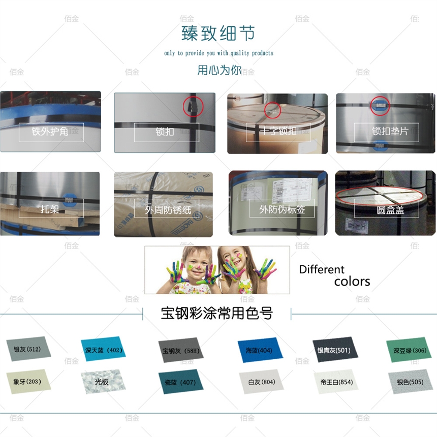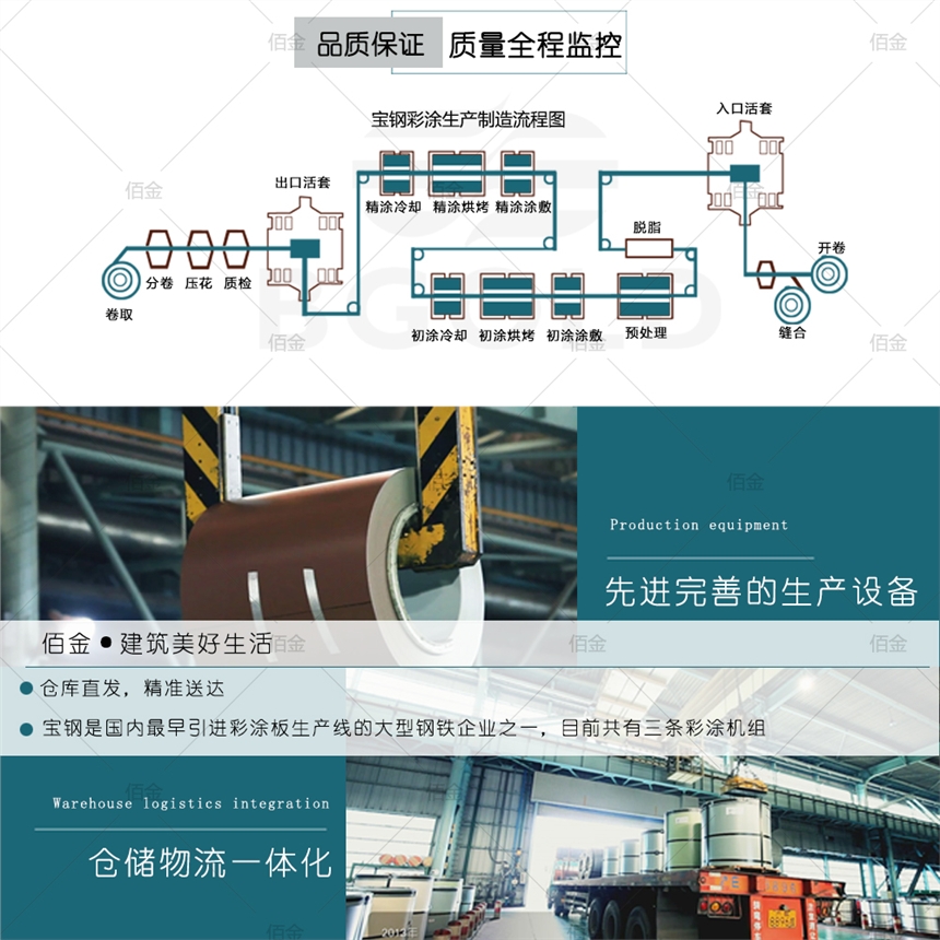 宝钢彩钢板采用的是高膜厚≥20μm,高镀层的技术指标,对产品质量进行严格管控,同时采用高品质的涂料,大大的增加了彩板的使用年限。