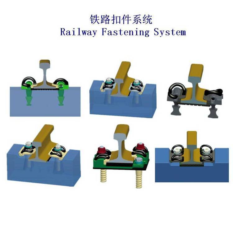 铁路钢轨扣件是轨道上用以联结钢轨和轨枕(或其他类型轨下基础)的零件,又称中间联结零件。其作用是将钢轨固定在轨枕上,保持轨距和阻止钢轨相对于轨枕的纵横向移动。铁路钢轨扣件系统分为:弹片扣件系统、扣板扣件系统、弹条扣件系统、道钉扣件系统。
