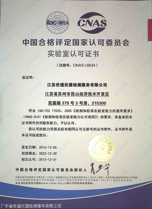世通校准检测规模大,占地面积约有上万平方米,拥有各类校准仪器设备和标准计量器具上千余台(套),仪器设备先进。校准人员素质高,目前与校准业务有关的员工近500多人,人员的素质好,技术水平高、经验丰富。机构成立时间长,资质齐全,获合格评定国家认可委员会校准实验室编号CNASL3170,世通校准检测优质的校准技术。有过众多的行业,甚至世界500强企业,对各行业的校准技术比较熟悉,对不同行业不同仪器精度,质量体系要求有深刻的了解。世通检测校准能力范围广,通过ISO国计量准则要求,认可校准项目几百项,认可范围涵盖广,涵盖长度、力学、温度、电磁、无线电、光学、时间频率、理化、声学、电离辐射计量专业。