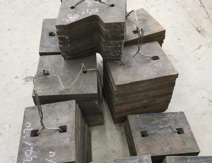具体镶铸生产工艺过程为:在型腔某部位预先放人具有良好耐磨性的预制块(高铬合金铸铁或钢结硬质合金),然后向型腔内浇注具有良好韧性的母液(高锰钢),通过母液强烈的热作用,使镶块与母液接触的界面上在一定的时间内处于熔化或溶解状态并发生元素的相互扩散及冶金反应,冷凝后,镶块与母材牢同的熔焊为一体。