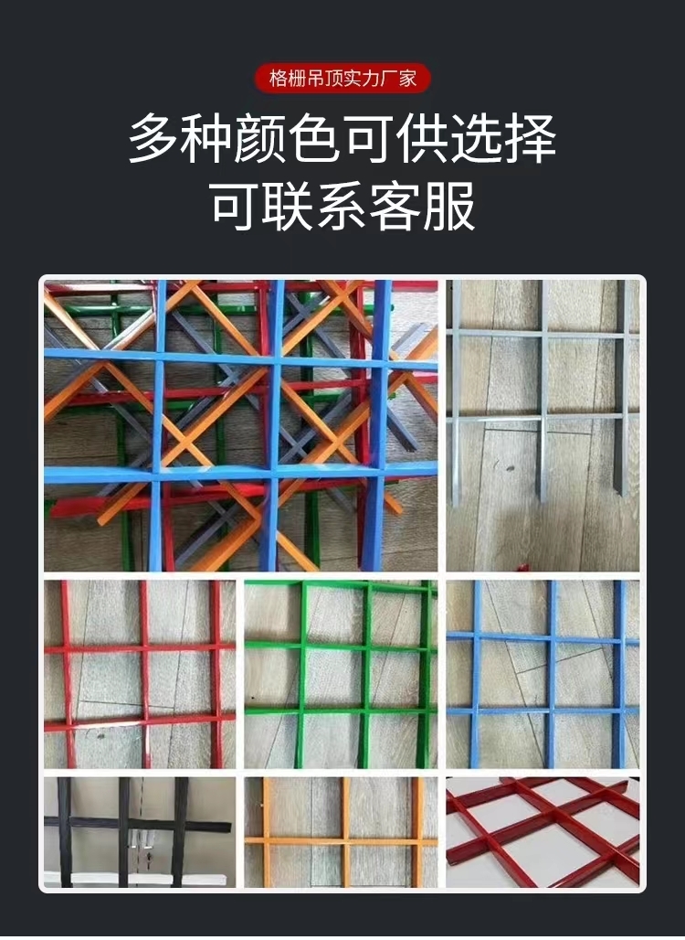 ? ? ? 方格格栅的主副骨根据不同要求可定制不同的尺寸,常规的主副骨格栅条侧面高度为35-80mm,格栅条的材料厚度为0.3-0.6mm、根据不同吊顶场所及设计要求,合理选配合适的材料料厚度及方格大小,兼顾吊顶效果及经济性。铝格栅天花根据款式不同一般分为方格格栅天花及三角形(菱形)格栅天花,方格格栅天花是目前市面上采用较多的一种款式。格栅天花吊顶系统分为格栅主骨和副骨,格栅主骨及副骨均为特制金属空腹板条。标准为10mm或15mm,高度有35mm、50mm和80mm可供选择。铝格栅格子尺寸分别有100X100mm,150X150mm, 200X200mm 可供选择。豪亚铝格栅 葡萄架吊顶铝格栅。铝方格格栅天花颜色通常为黑白灰及木纹色,也可根据要求定制其他色彩。