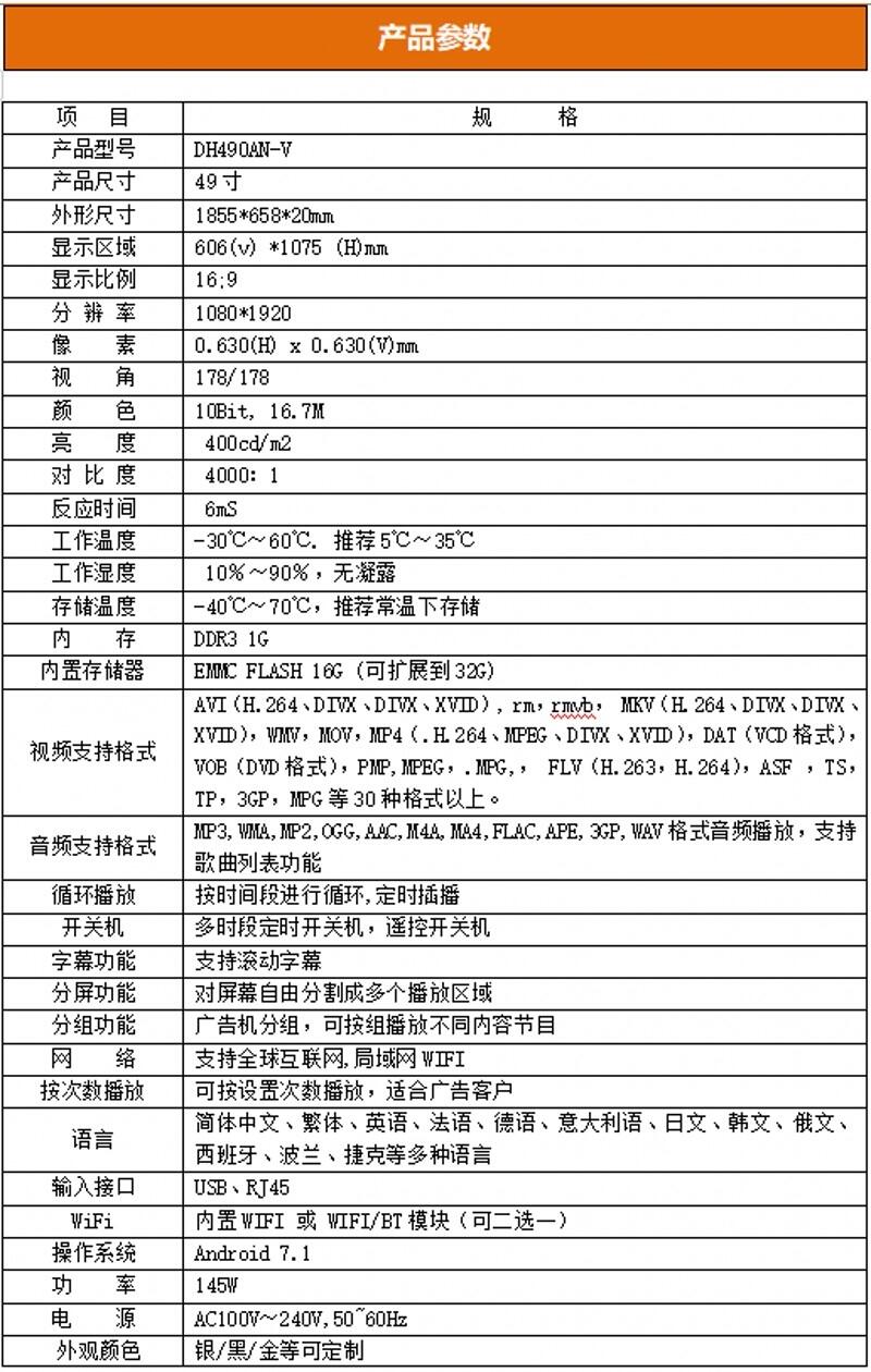 u 功能齐全:支持横竖屏播放,视频分屏,滚动字幕,定时开关,USB数据导入等功能。