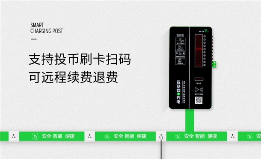 3.1、标准实用型投币刷卡式微信扫码式电动车充电站,是有一台控制器外加10个两孔插座构成。