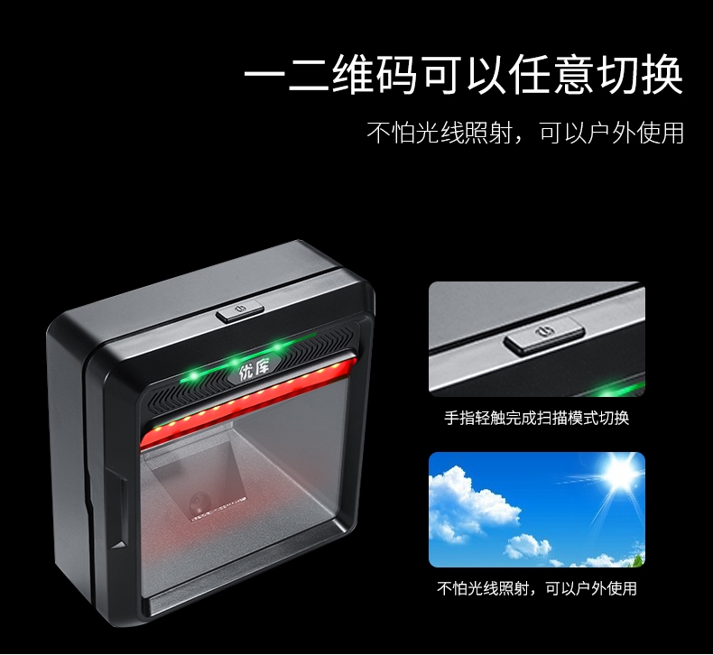高速工业级二维扫描平台,大窗口任性扫,屏幕可扫;影像一二维扫描,COMS影像式,即插即用,蜂鸣提示,防震抗摔,扫码支付,全方向扫描;高速扫描,4.0米/秒,自主研发核心算法,解码更快速;大窗口任性扫,全向免持式扫描,无需手持,解放您的双手,让您 的工作效率更高;一次购买,解决您的全部需求,它在商品线性条码的扫描上拥有一次扫描通过率,同时它还能帮助零售商解决不断增长的数字条码的读取需求,而不需要额外的扫描器;可读取印刷的一维码及数字式一维、屏幕二维码、PDF条码;轻松读取手机屏幕一维、二维码,带给你高效的收银体验;支持zhi fu bao、百旺公众号,助手APP等;可扫大大小小条码,码制大小、码制种类、错码、断码、脏码等;影像式扫描,广角摄像头,相比传统激光扫描,识别范围广,速度快;一二维码可以任意切换,不怕光线照射,可以户外使用;自动感应扫描,节能省时,当商品条码经过扫描窗口时中,瞬间唤醒平台读取条码;即插即用,兼容各大系统;适用多种行业,各种场合,商店超市,餐厅甜点,扫描方便快捷。