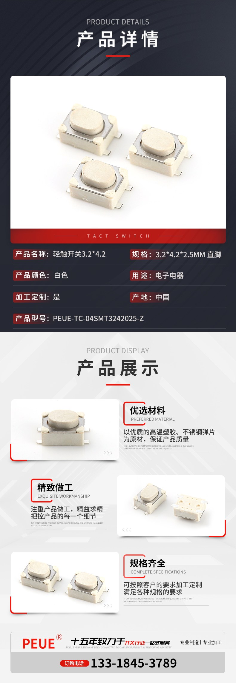 轻触开关3.2*4.2*2.5mm直脚