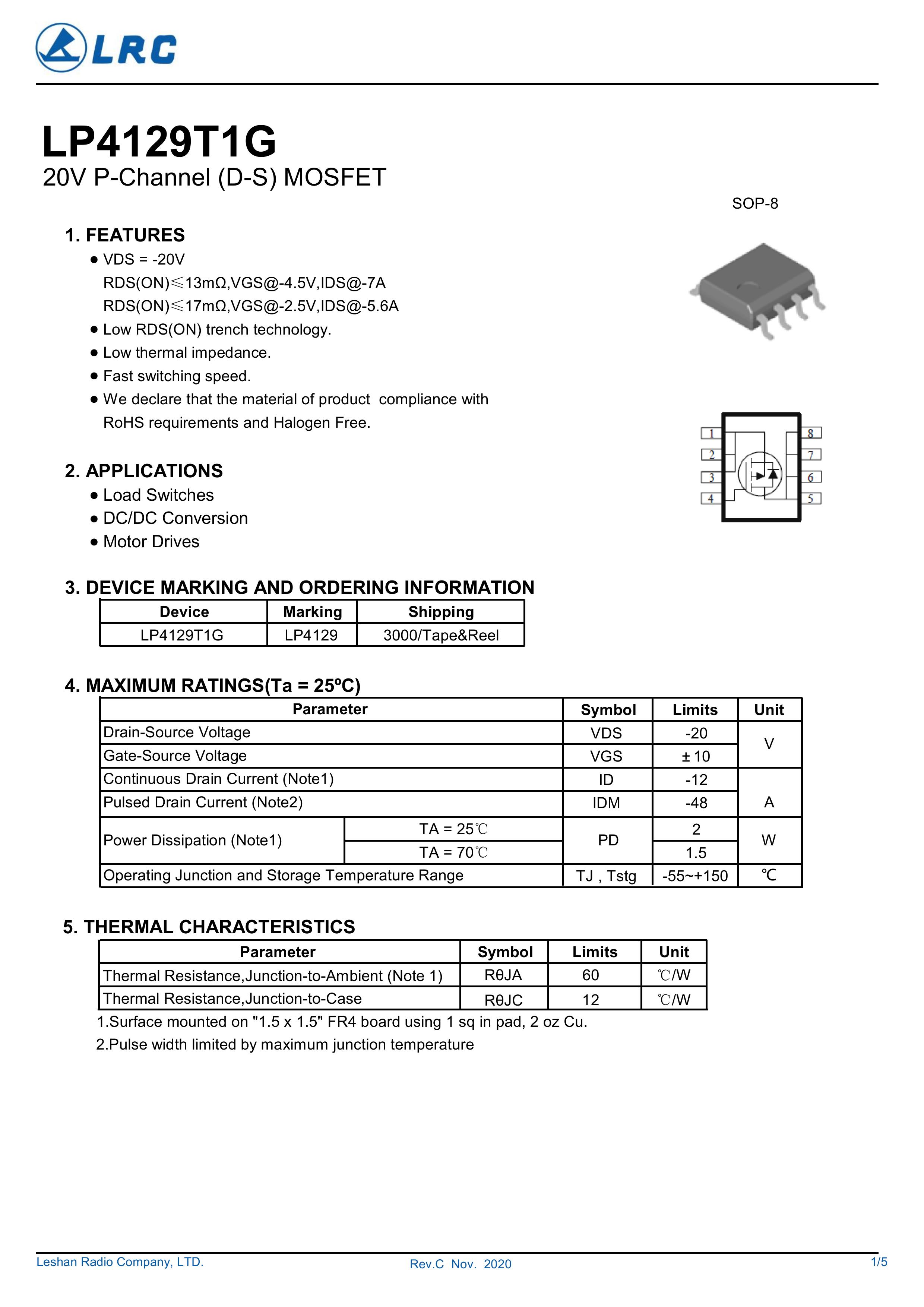 LRC/乐山无线电 LP4129T1G/LP4129 全新原厂原装中低压高频分立式功率器件电子开关场效应管,P型沟道场效应管负电压-20V、-15A、13mΩ、P-Channel、贴片式中低压MOSFET: LP4129T1G/LP4129。Vds电压:-20V;Id电流:-15A;Rds(on)内阻:13mΩ;封装方式:SOP-8;最小包装数量:4000pcs/盘-编带。