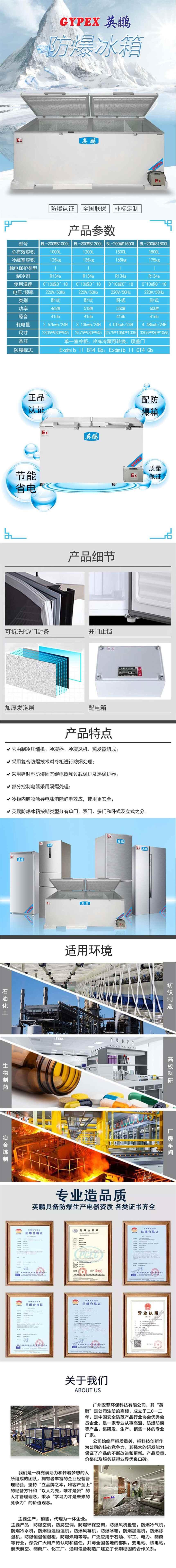 品牌: 英鹏 型号 BL系列 气候类型 SN.N.ST 总有效容积 (L) 额定电压 AC220(V) 额定频率 50(Hz) 制冷方式 直冷 特点 加厚致密发泡 制冷温度 机械温控 压缩机 双压缩机 温度范围 0≤t≤10(℃)或≤-18(℃) 额定功率 398(W) 额定耗电量 2.24(Kwh/24h) 噪声 38 重量 109KG 制冷剂 R134a/R600a 外形尺寸 2215x780x945mm 包装尺寸 2275x785x1030mm 防爆标志 Ex d e ib mb IIB T4 Gb 适用范围: 1.本产品适用于石油化工、实验室、冶金、医药、纺织、食品、生物工程、制药、仓库、航天航空工程及军 工等性环境中,有温度控制要求的场所; 2.1区、2区危险气体场所 3.IIA、IIB、IIC类T1-T4组性气体或蒸汽环境; 4.环境温度:-5℃~+43℃。 可广泛使用于石油、化学化工、医药、航空航天、实验室、储藏、军事等部门具有ⅡC级,温度组别为T4的爆 炸性气体混合物的l区(或2区)内部危险性场所,BL系列工业级集成防爆冰箱,是采用集成防爆技术,按工业环 境使用要求制造的ⅡC级防爆制冷系统。 整机采用国际领先超弱电技术隔离本质安全型电路,经特殊工艺制造和防爆处理,产品的设计、制造严格按产 品严格按照国家相关标准: GB 3836.1-2000 《性气体环境用电气设备 第1部分:通用要求》 GB 3836.2-2000 《性气体环境用电气设备 第2部分:隔爆型“d”》 GB 3836.3-2000 《性气体环境用电气设备 第3部分:增安型“e”》 GB 3836.4-2000 《性气体环境用电气设备 第4部分:本质安全型“i”》 GB 3836.9-2006 《性气体环境用电气设备 第9部分:浇封型“m”》 产品表面采用最高表面温度限制保护技术和全面的防静电技术,及多种安全保护技术;