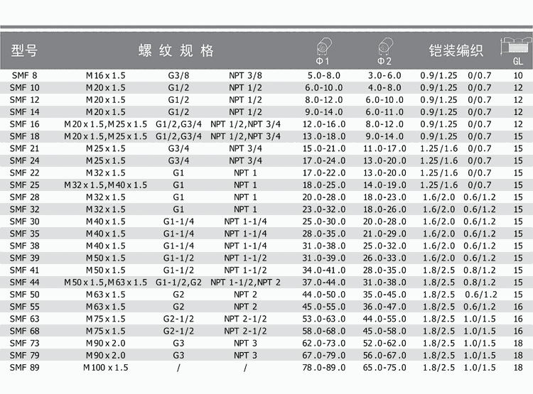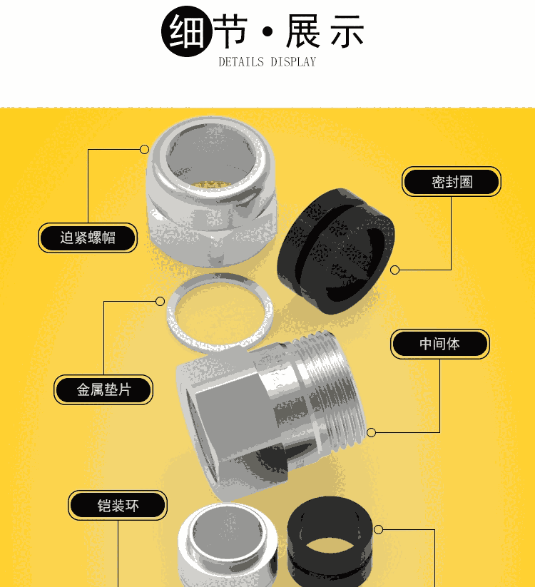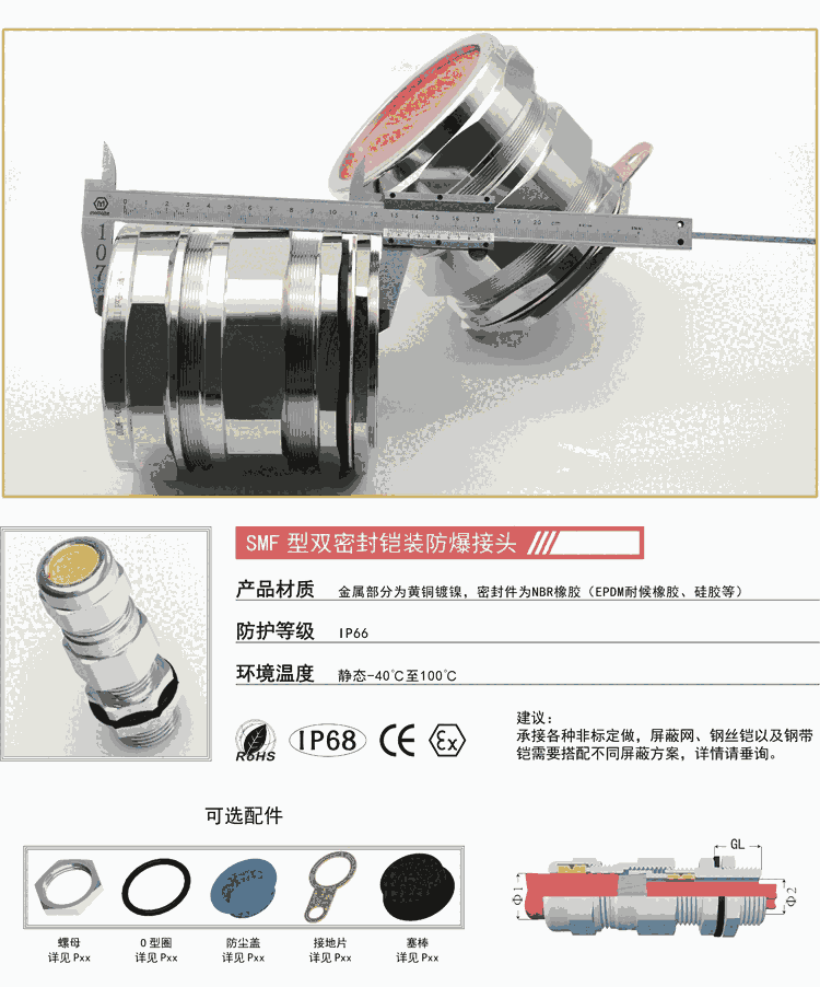 螺牙规格:公制牙M、德制牙PG、英制牙G及美制牙NPT产品材质:A.C.F 部份用304钢材制作而成,E 部份以 UL 认可之尼龙PA66 制成( 防 火等級 UL 94V-2 )B 及 D 部份采用硅胶制成。