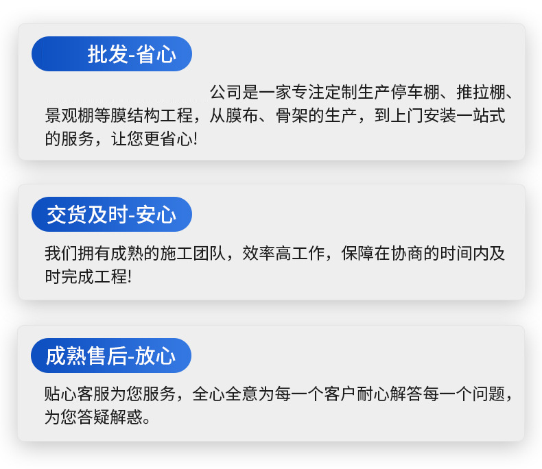 3.膜结构系列产品、张拉膜系列产品定制需要签订正式合同,明确款式、规格、颜色、及工期,违约责任及赔付。