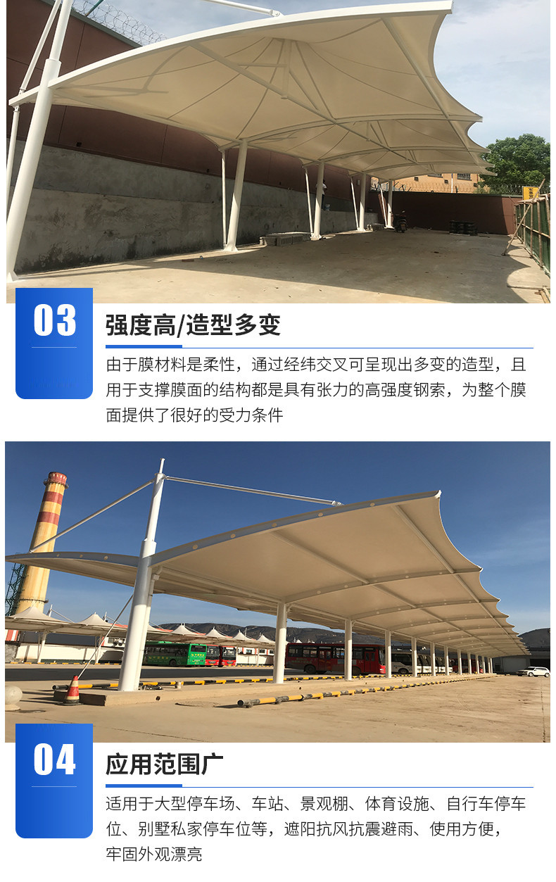 膜结构车棚适用场景:小区、文化广场、各种商业街边、各种停车场的车棚建筑。