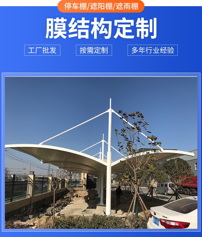 膜结构车棚是由钢结构和膜材组成,分别有张拉式膜结构、索膜结构、骨架式膜结构、空间结构式等供选择,根据不同场景进行设计。