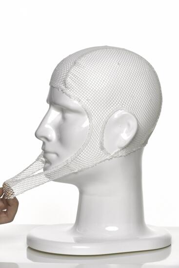 医用弹力绷带帽呈筒形帽状,具有一定的弹性,其下配有一条帽带,外观应光洁、平整、松紧一致、表面无色差、无污渍、针距均匀、无漏针、网孔无断线。