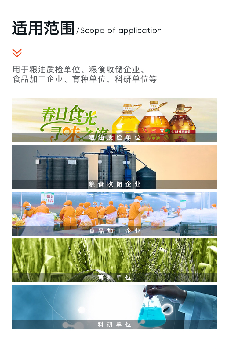适用范围 | 粮油质检单位、粮食收储企业、面粉厂、食品加工企业、育种单位、大专院校、科研单位等 | ||