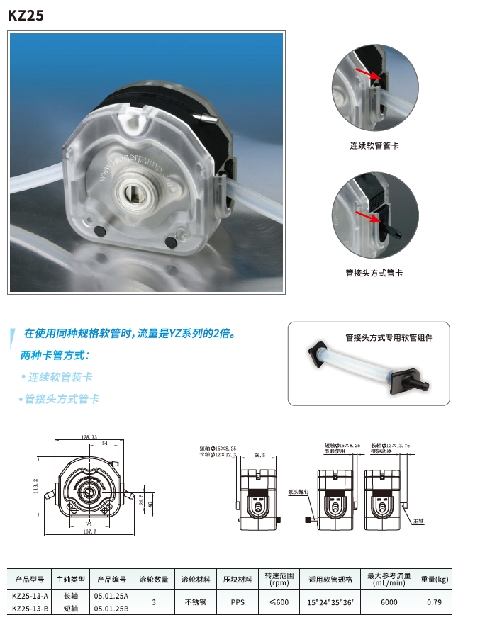 快装型蠕动泵泵头KZ25在使用同种规格软管时,流量是YZ系列的两倍。KZ25泵头有两种卡管方式:连续软管装卡和管接头方式管卡。KZ25采用不锈钢材料,外壳采用PC材料,柔韧度适中,晶莹剔透,一目了然,上压块采用PPS材料,良好的自润滑性,能减少软管磨损,刚性好,结构稳定,化学稳定性好,耐高温,PPS+PS+SS=完美的组合,表现出优异的技术性能和使用性能。
