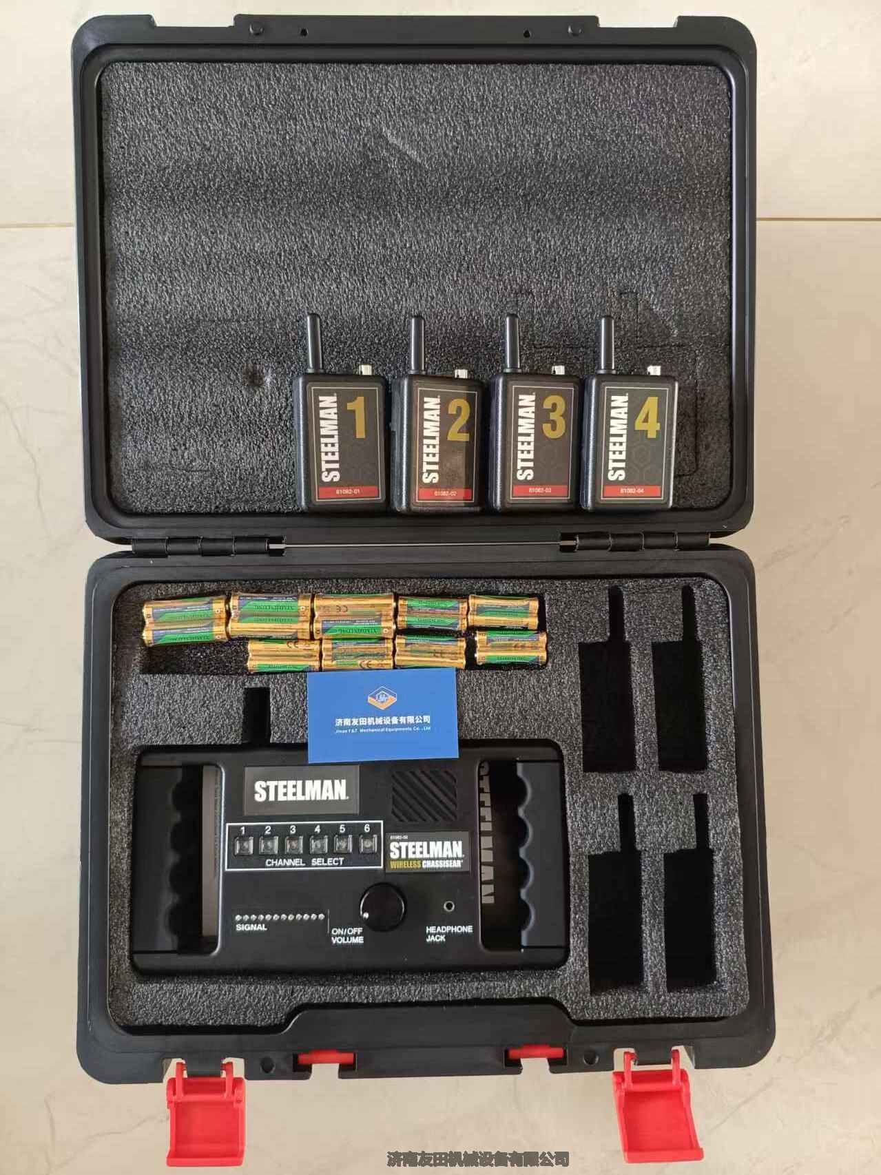 STEELMAN 61082随货带有工具箱(如下图所示)标配带有4个无线底盘发射器 (STEELMAN 61082-01,STEELMAN 61082-02,STEELMAN 61082-03,STEELMAN 61082-04),另外,用户还可以根据使用情况选配2个无线底盘发射器 ( STEELMAN 61082-05,STEELMAN 61082-06)。整套设备包含了控制单元,发射器,连接线夹,电池,绑带,记录本。用户拿到工具套装应该首先核对清单,然后再组装使用。
