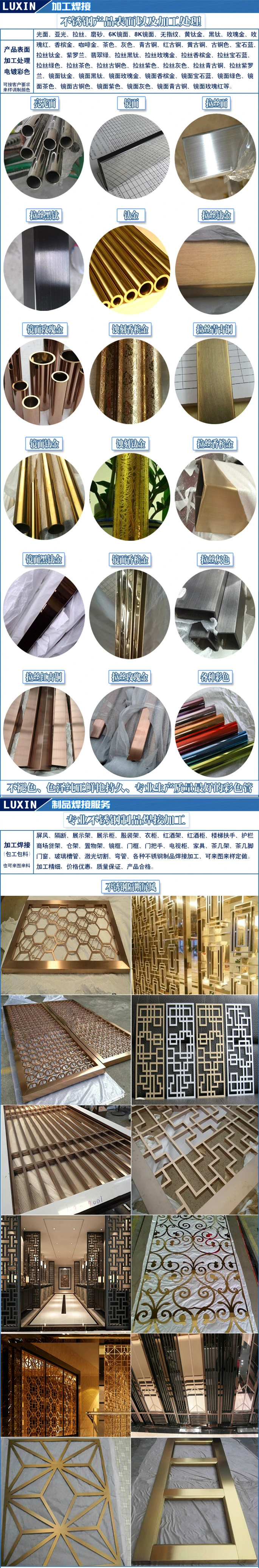 供应201-304-316L加工电镀|拉丝|喷砂|磨砂|抛光|6K镜面|8K镜面|蚀刻|压花图案|木纹转印|黄钛金|黑钛金|玫瑰金|香槟金|灰色|茶色|仿古铜色||红黄青古铜|装饰圆管|方矩管|制品管等