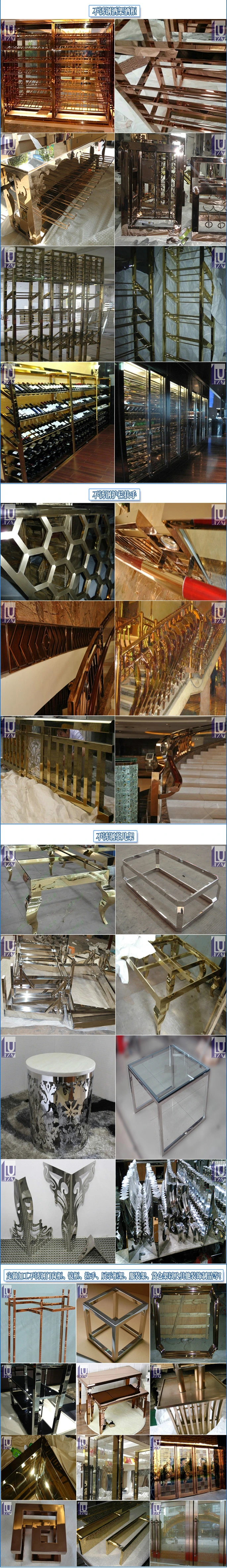 加工设计和生产焊接高档不锈钢制品的厂家:不锈钢楼梯、不锈钢护栏、不锈钢扶手、不锈钢围栏、不锈钢门框、不锈钢窗框、不锈钢镜框、不锈钢酒架/红酒架、不锈钢拉手、不锈钢展示柜、不锈钢展示架、不锈钢屏风、不锈钢隔断、不锈钢花格、不锈钢激光镂空屏风隔断、不锈钢包边等各种不锈钢制品、