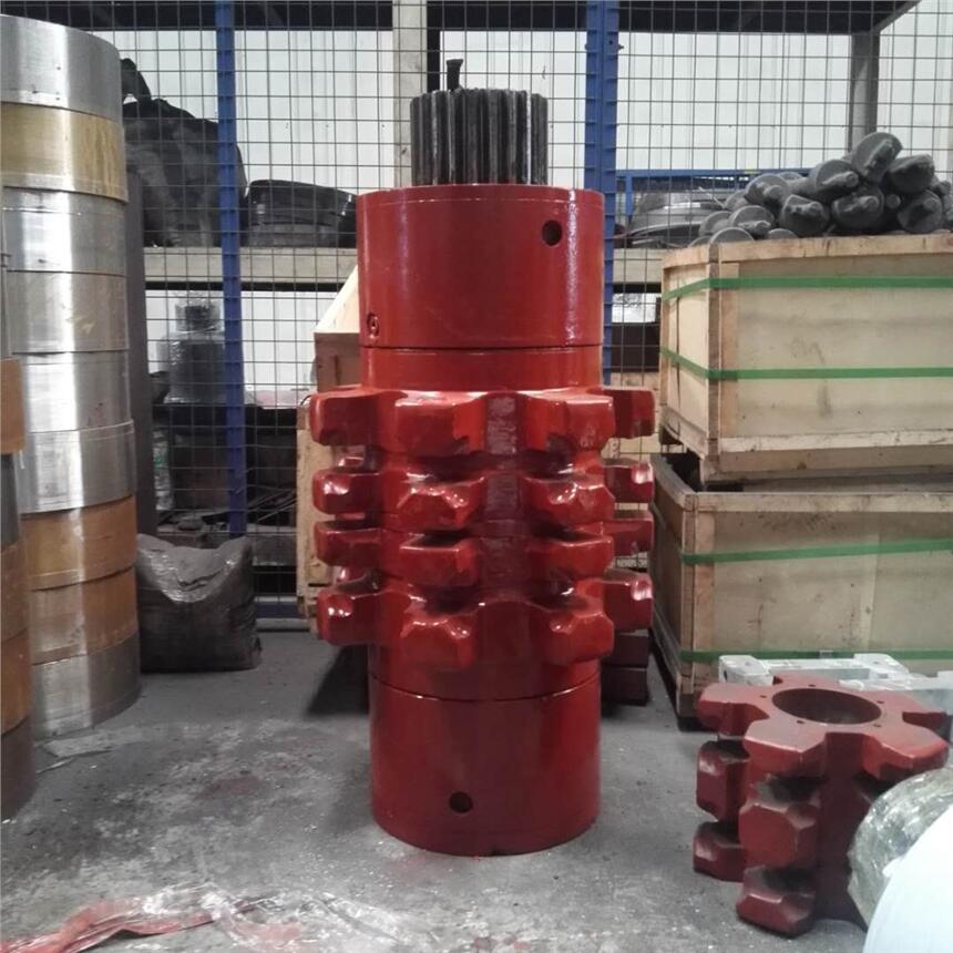 链轮组件主要由链轮和连接滚简组成,它是刮板输送机的重要传动部件。刮板链由链轮驱动运行,链轮轴是整个输送机承受扭矩大的零件。刮板输送机的运输能力愈大,铺设长度愈长,链轮传递的力矩也愈大。这就要求链轮既要具有较高的强度和耐磨性能,又要具有韧性,能够承受工作中脉动载荷和附加冲击载荷,所以,链轮应选用优良材质制造。为了使刮板链与链轮正确啮合运行,减少磨损,延长使用寿命,要求链轮有合理的几何尺士和较高的加工精度。滚筒使2个链轮联成一体,它只传递扭矩,不与刮板链啮合摩擦,一般均用42CrMo制造。