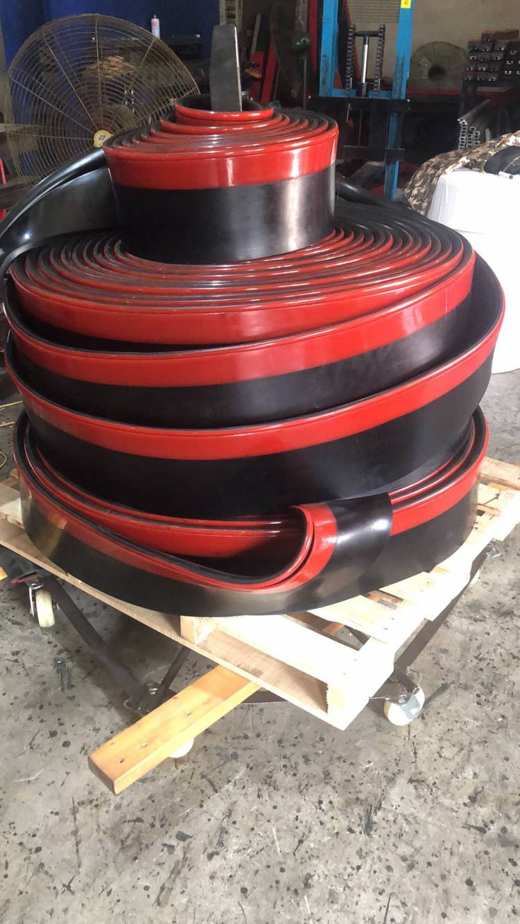 ?防溢裙边的主体部分为黑色,采用橡胶和天然橡胶混炼而成,在保持挺括的基础上增加弹性,副板红色的聚氨酯密封条紧密的贴服在输送带上,达到双层密封效果。?