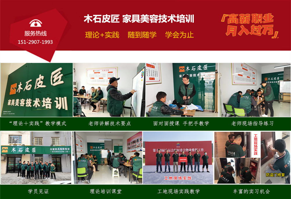荒年饿不死手艺人,打一份工可以养家糊口,学一门手艺可以发家致富!家具美容,从业人员少,收入待遇高,工作自由,轻松过万。学习家具美容技术,就选择“木石皮匠家具美容培训”,专业维修服务机构,多年一线实战经验,强大的合作伙伴,丰富的实习机会。50人的团队现场实践教学,面对面培训,手把手指导,工程现场实践教学,让您快速掌握家具维修技术!