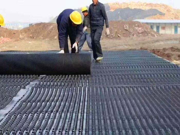 排水板锥形凸台顶面连接一层过滤土工织物,防止土颗粒通过,避免堵塞排水通道,使排水通道畅通。传统的排水方法采用砖石瓦作为过滤层,多用卵石或砾石作为水处理层,将水送至地下管网。用排水板代替鹅卵石水处理层,可以节省时间、投资,降低建筑物的荷载,良好的排水系统对土木工程施工期和结构物的正常使用和寿命起着重要作用。排水板和多孔排水管形成一个有效的排水系统,圆柱形多孔排水板和土工织物也形成一个排水系统,从而形成一个具有渗水、蓄水和排水功能的系统。