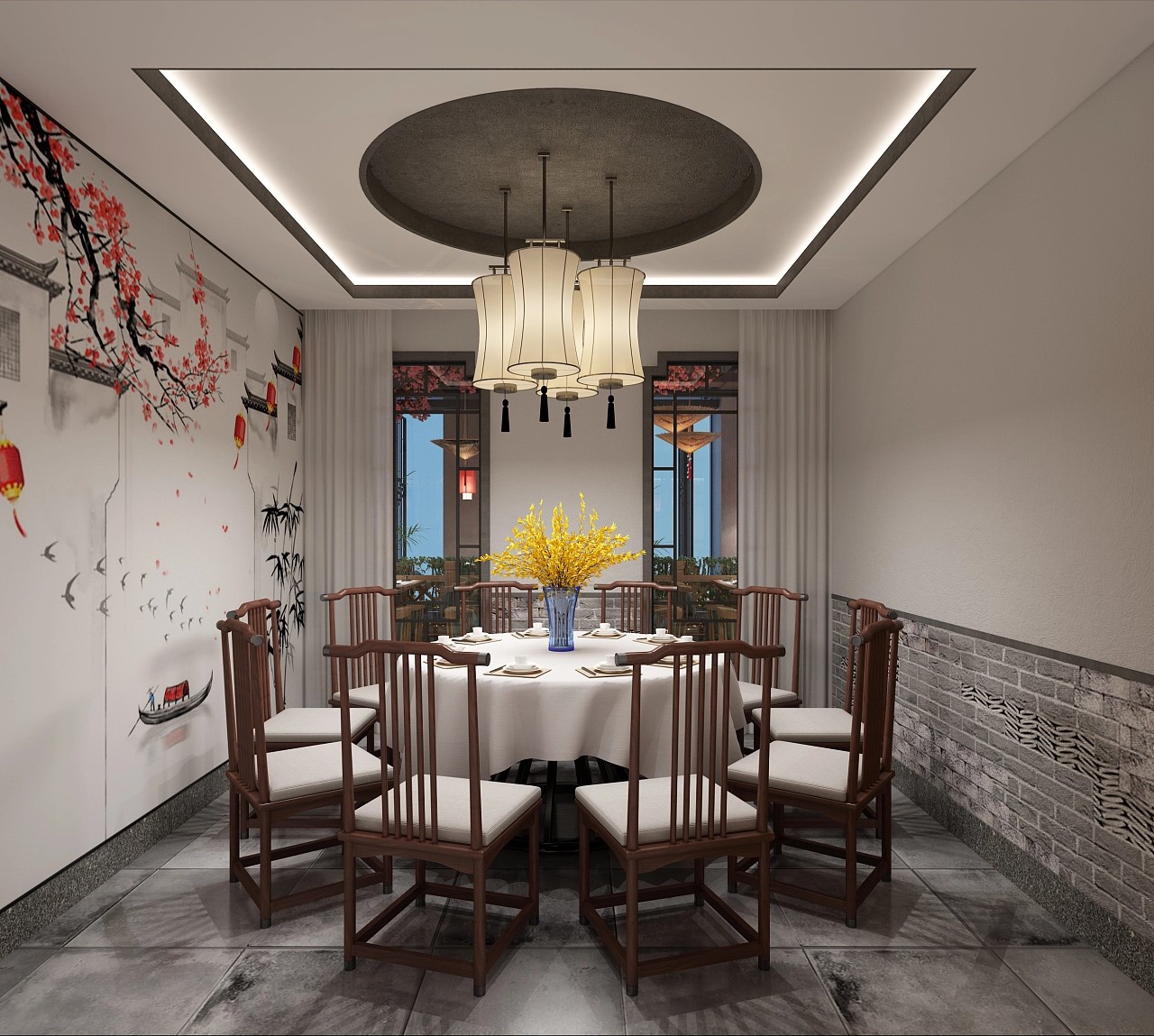 装饰元素:中餐厅的装饰元素应该以传统文化和艺术为主,如传统画、书法、陶瓷、造景等。这些元素可以营造出浓郁的文化氛围,让顾客在用餐的同时感受到传统文化的魅力。