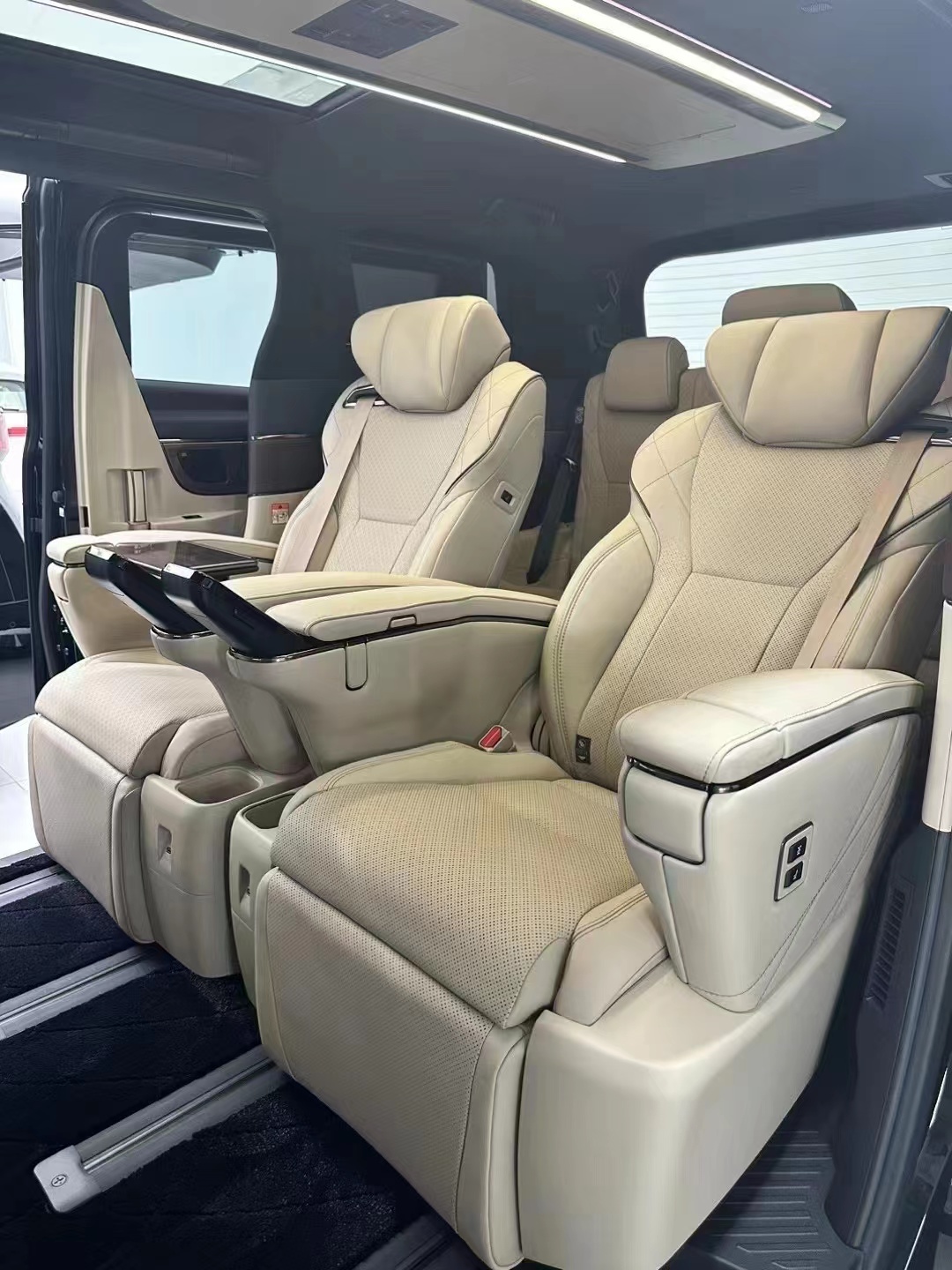 进入车内,全新丰田埃尔法的内饰设计同样令人惊艳。中控台采用对称式布局,配备了大尺寸悬浮式触控屏幕和多功能方向盘,为驾驶者提供了便捷的操作体验。座椅采用高级皮革包裹,提供出色的支撑和舒适度。此外,车内还配备了丰富的豪华配置,如后排娱乐系统、空调控制系统、以及多区域自动空调等,为乘客带来了愉悦的旅途体验。